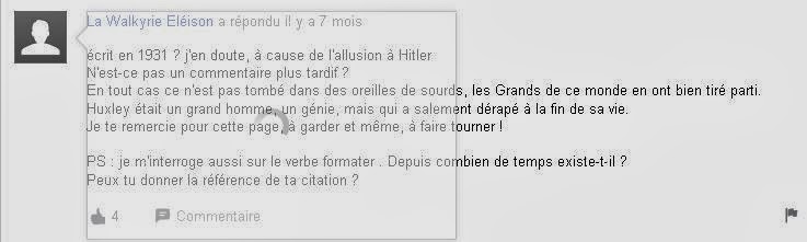 « Le livre de Huxley est paru en 1932. Son caractère visionnaire est stupéfiant. Presque inquiétant. Tous les ingrédients du roman sont aujourd’hui effectivement réunis pour que le scénario soit … en passe d’être réalisé. Si nous devions formuler dans un discours une prosopopée du cynisme politique incarnée par le personnage cynique d’Huxley, cela donnerait quoi ? »